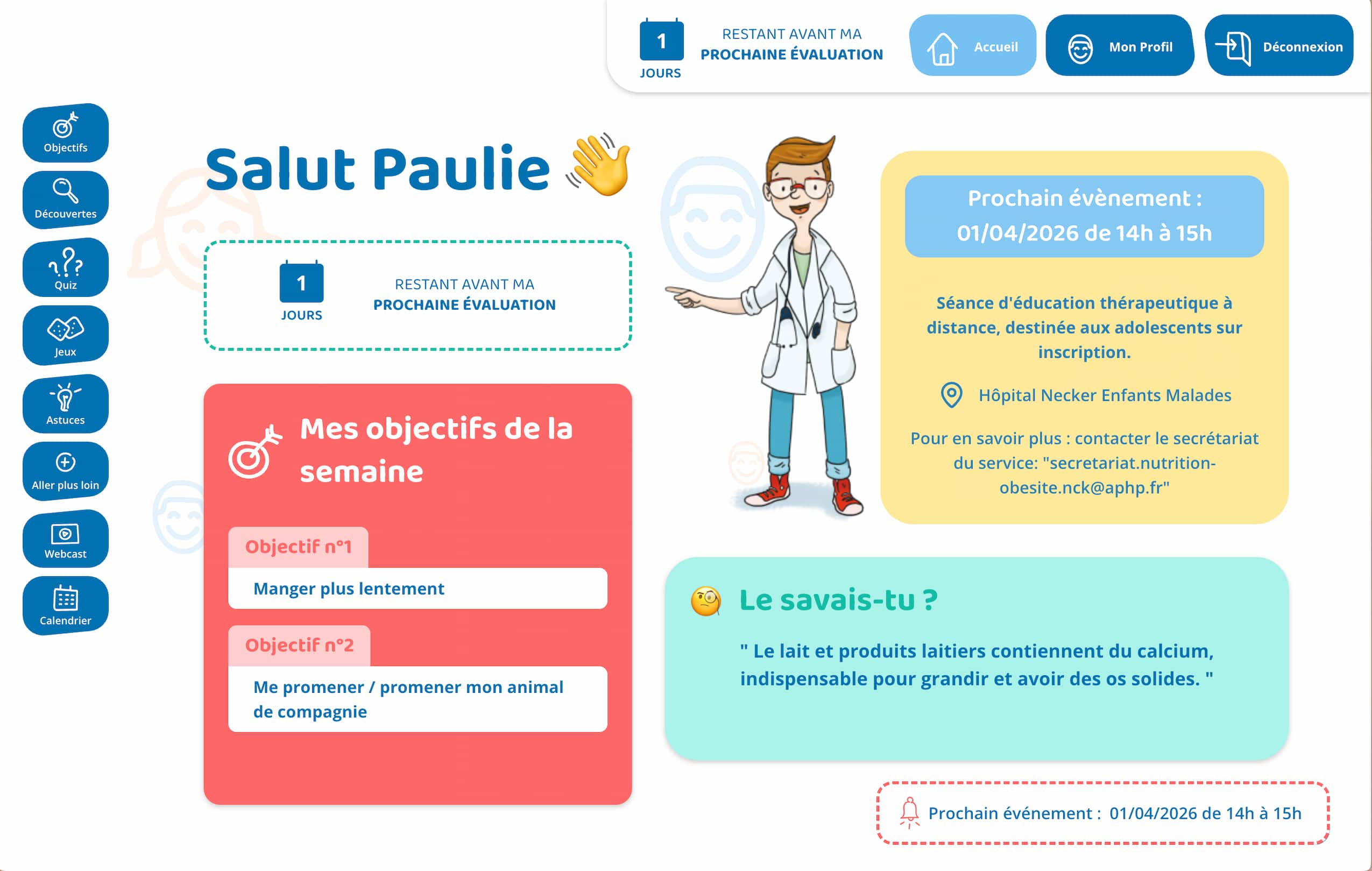 Ce dispositif digital, conçu initialement en 2019, vise à accompagner les enfants et adolescents (8–17 ans) dans leur parcours de soin, en lien avec les équipes médicales et les familles.